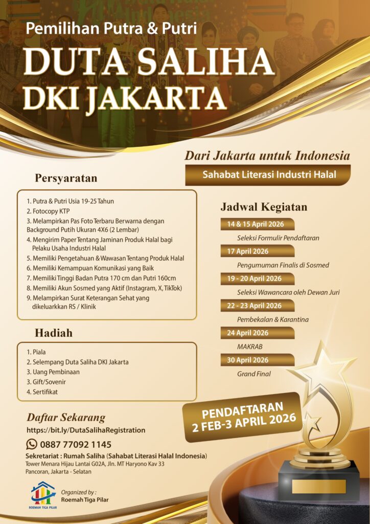 Dalam upaya melahirkan generasi muda yang berintegritas, berwawasan luas, serta peduli terhadap perkembangan industri halal di Indonesia, Rumah Saliha (Sahabat Literasi Halal Indonesia) kembali menghadirkan ajang Pemilihan Putra & Putri Duta Saliha DKI Jakarta 2026.